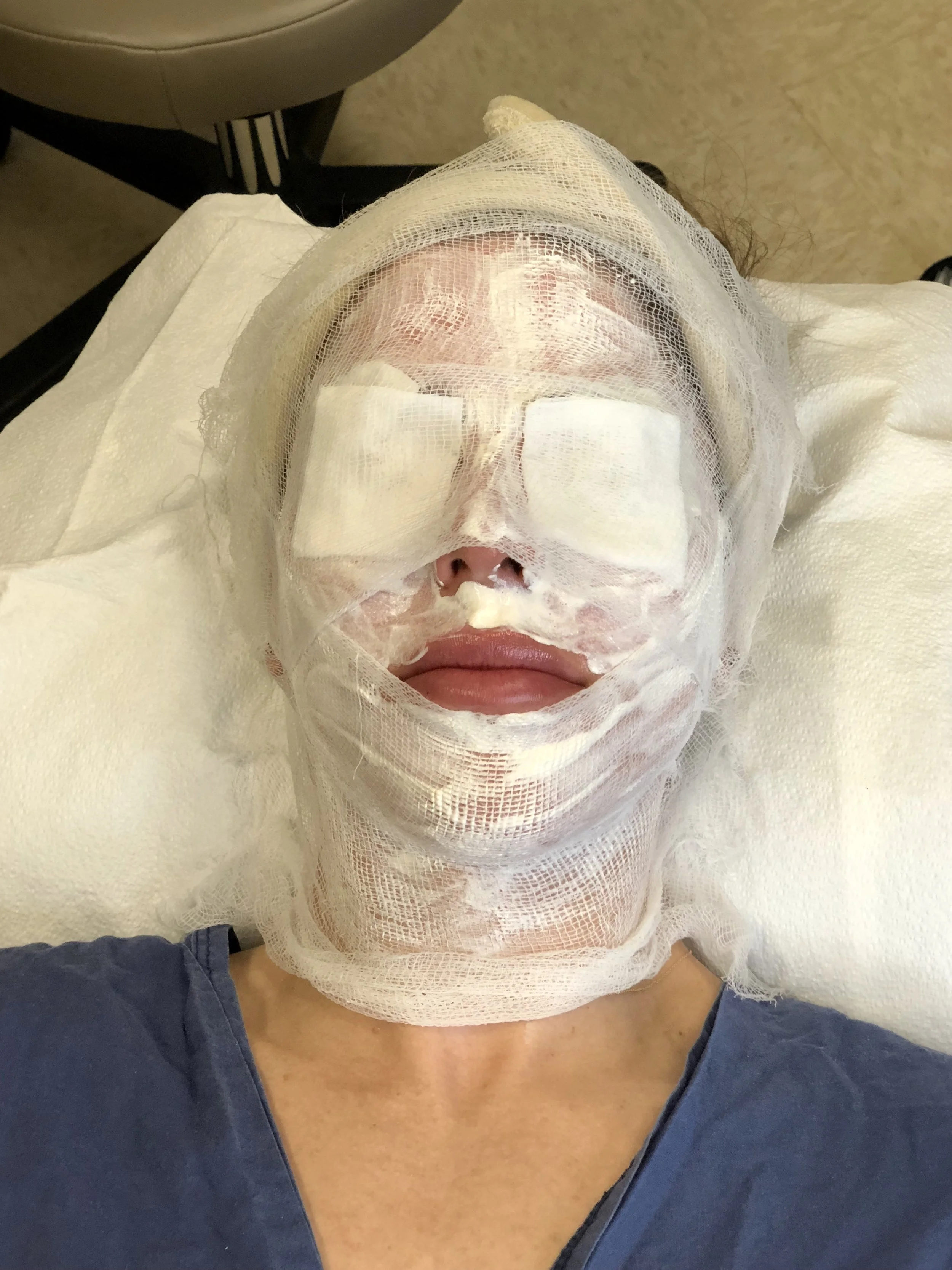 Step 6: Cold Mask #2. Here's where the treatment got freaky. Right over the mask I already had on the face, she covered my entire face with the mesh gauze. She had me close my eyes and then put gauze pads over them. So from this point on, I had no idea what was going on and I had to rely on Dr Z (who was taking these photos to find out what happened). I really tried to relax, but I have to admit that I felt a bit like I was doing a trust fall activity at a school retreat. She applied a thick, green mask with micro crystalline algae all over my entire face including over my protected eyes. The mask cooled into a rubery consistency and she use these cold metal Cryo Sticks to massage and cool the skin. I could not believe what I looked like when I saw the photos! After about 10 minute, she rolled the mask right off my face.